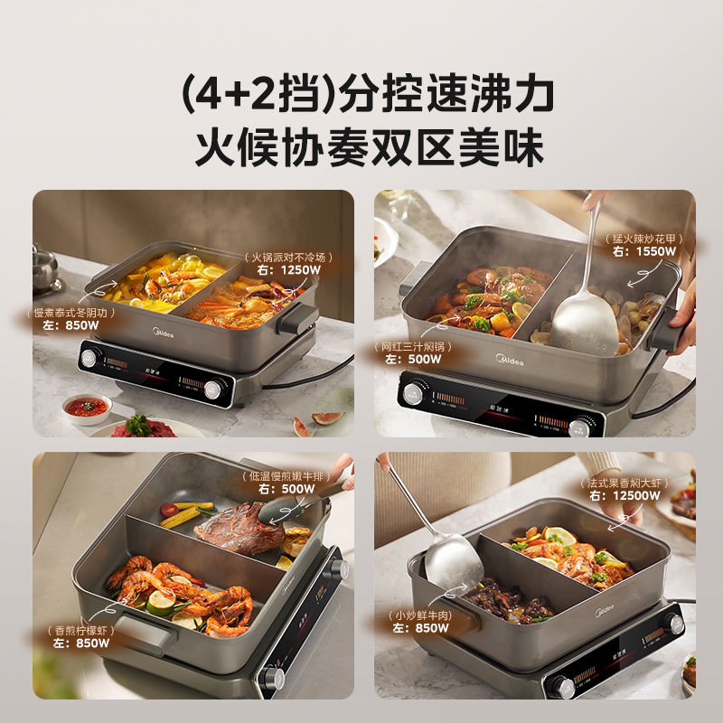 朋友小聚:分控独立调温,左锅煮火锅,右锅煎牛排,边吃边聊不冷场。