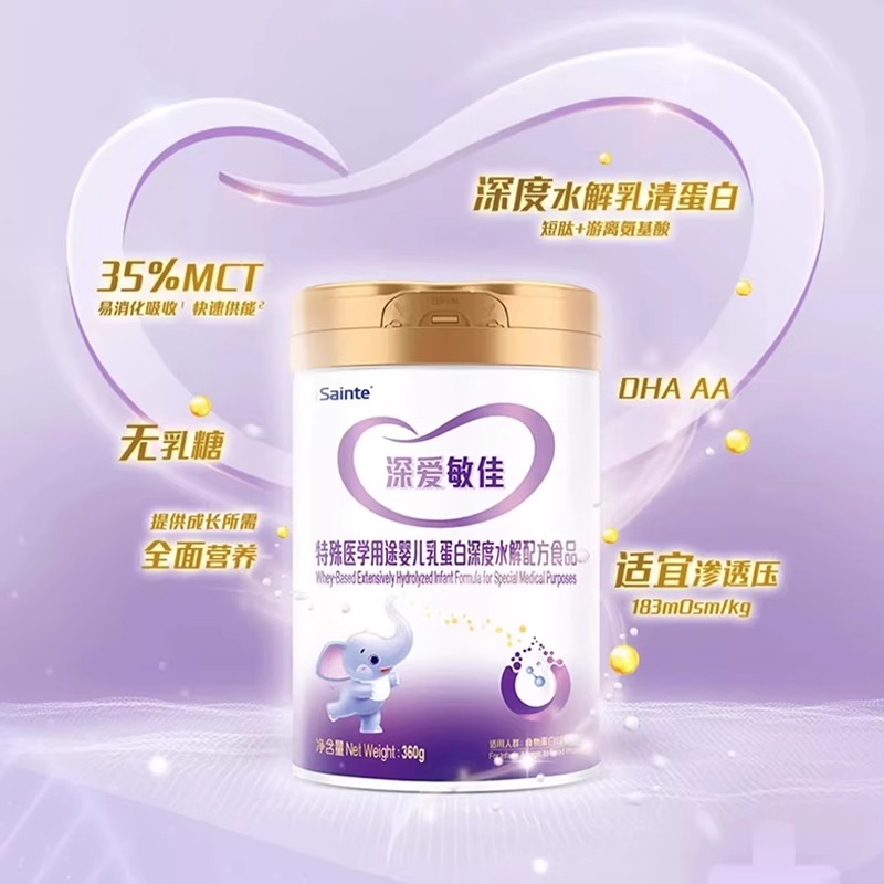 针对0-6月龄乳蛋白过敏高风险婴幼儿设计,采用深度水解工艺,将大分子乳蛋白分解为小分子肽段和氨基酸,显著降低过敏原性,同时保留完整营养结构。临床验证,90%以上敏宝饮用后过敏症状(如湿疹、腹泻、吐奶)明显缓解,是“敏宝家庭”的安心之选。