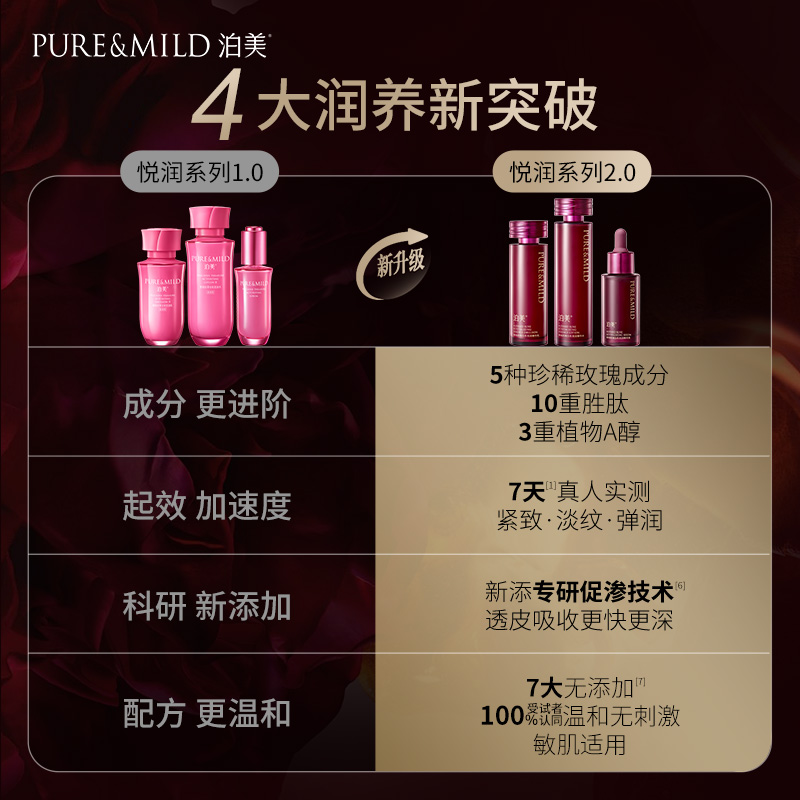 | 维度 | 泊美玫瑰水乳 | 竞品A(日系贵妇牌) | 竞品B(平价国货) |