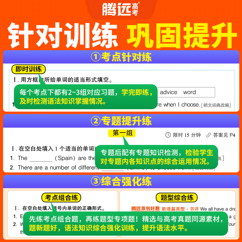 还在为高中英语语法头疼?面对语法填空、阅读理解、完型填空总丢分?《腾远高考·高中英语语法全解》专为高一至高三学生设计,结合高考考法与语境教学,让语法学习从“死记硬背”变为“活学活用”。