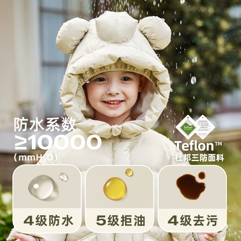 杜邦三防外层:防水(防泼溅/防雨雪)、防油(火锅酱汁一擦即净)、防污(泥渍/果汁轻松处理),户外玩耍不怕脏,妈妈省心更安心。