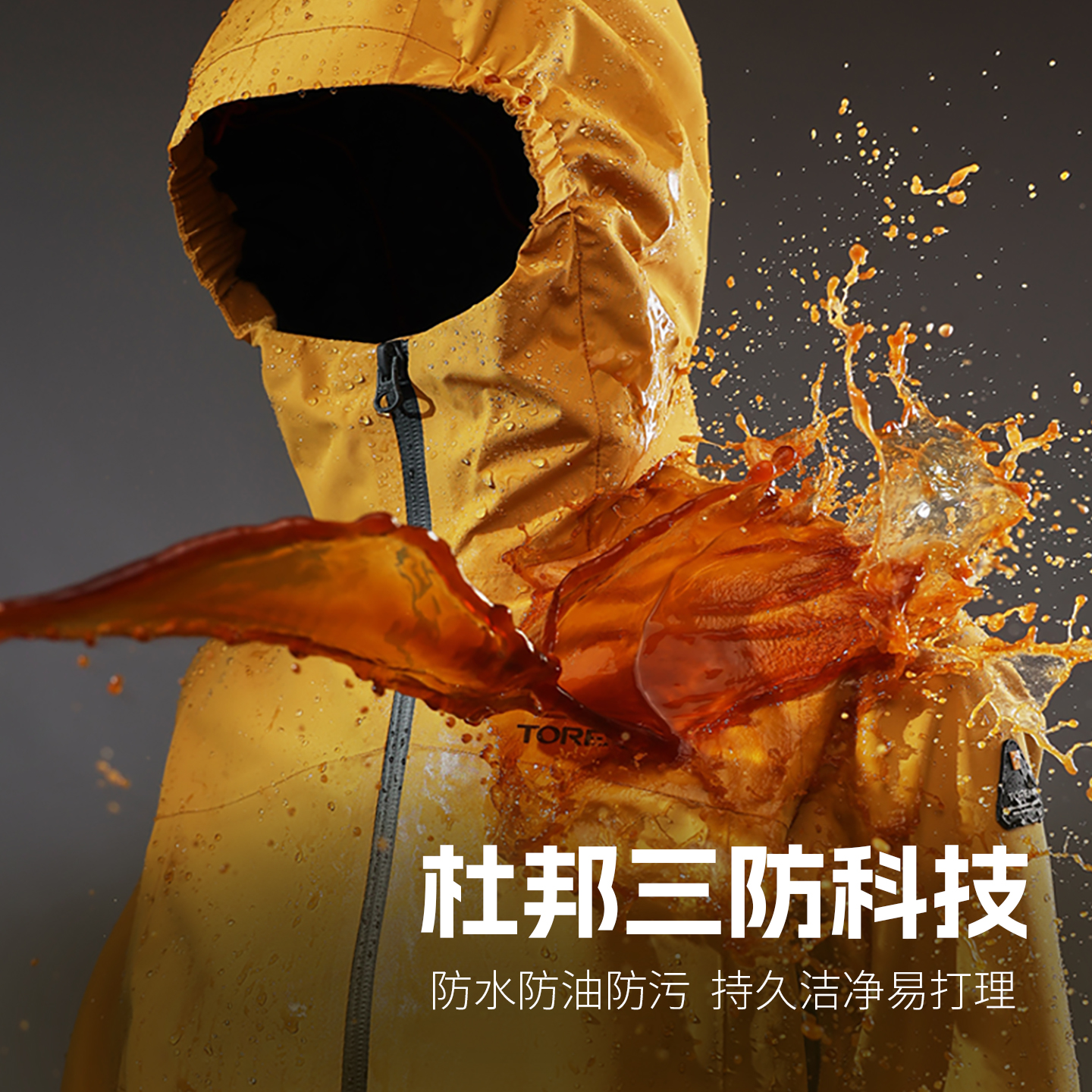 采用探路者专利「Storm Shield」全压胶工艺,表面覆盖超疏水涂层,实现防暴雨级防水(静水压≥10000mmH₂O),同时具备抗油污特性,奶茶、果汁一擦即净,解决家长“洗衣焦虑”。