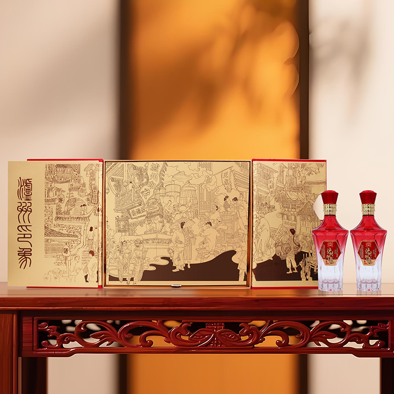 礼盒设计:双瓶装搭配鎏金礼盒,红色烫金纹样彰显喜庆,附赠定制分酒器+酒杯套装,送礼体面又实用。