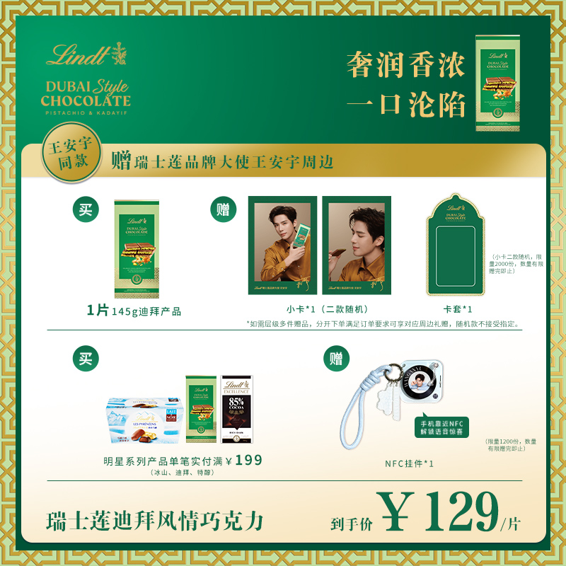 88会员+9折券后仅101!!Lindt/瑞士莲迪拜巧克力开心果夹心145g!!赠王安宇小卡+卡套+礼品袋!!