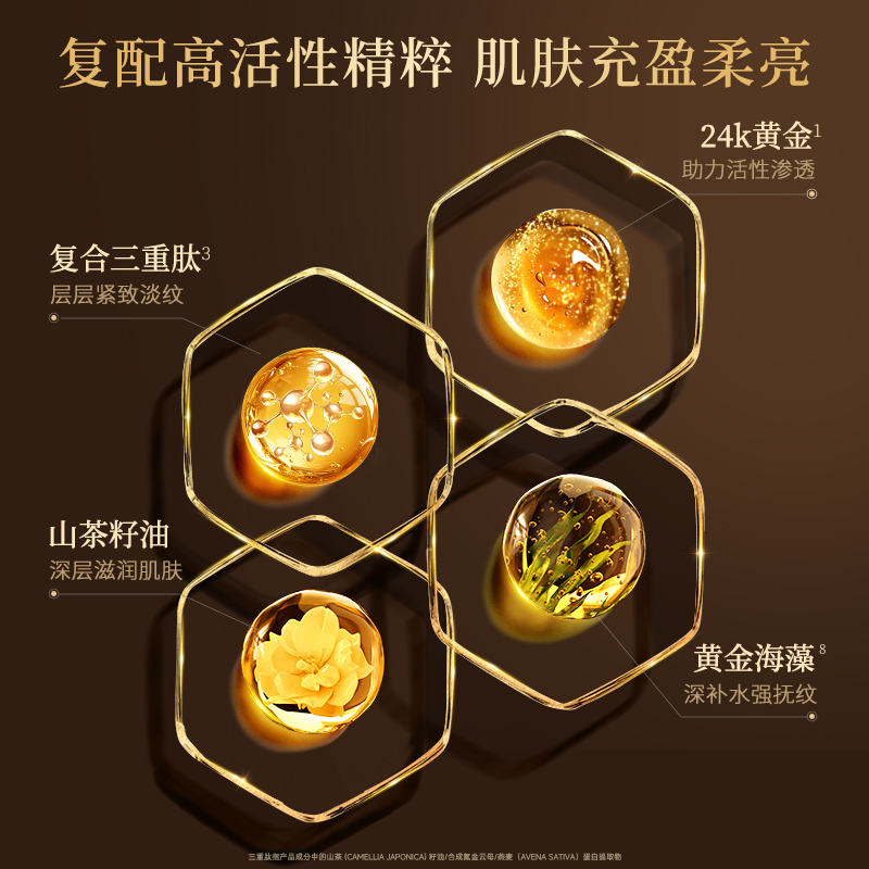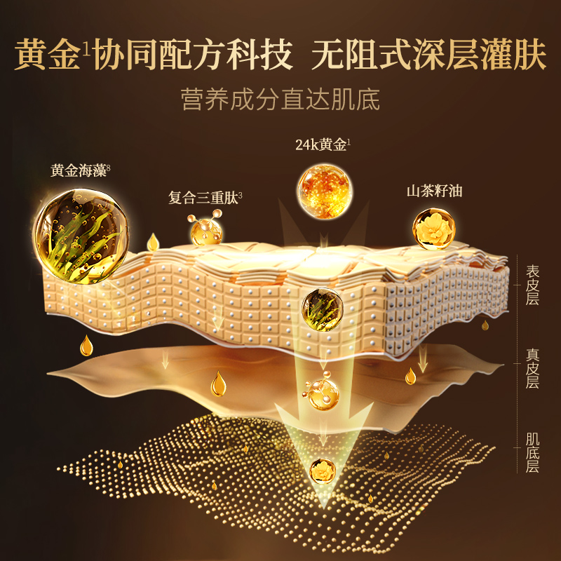 黄金微粒:采用可溶性黄金成分,深入肌底激活细胞代谢,提升肌肤光泽度,同时形成天然抗氧化屏障,抵御外界刺激。
