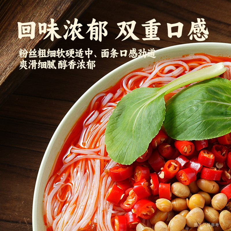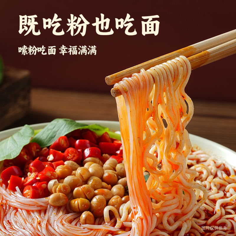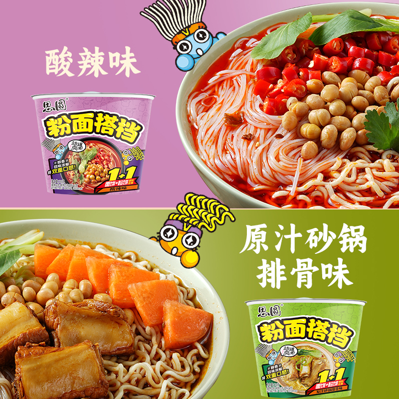 思圆粉面搭档突破传统泡面单一形态,创新「粉+面」双主食组合,一桶满足双重口感需求。桶装设计便携易带,无论是加班深夜、户外旅行还是宿舍加餐,3分钟冲泡即享热乎美味,告别外卖等待与脏手烦恼。
