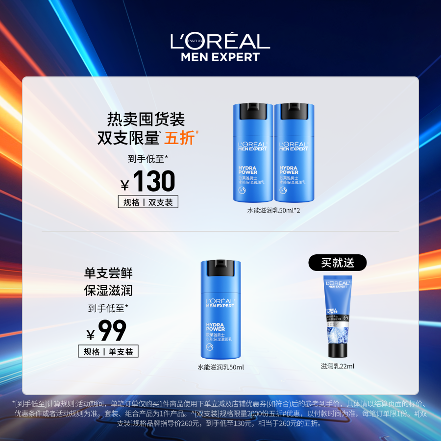 产品详情:欧莱雅男士水能保湿滋润乳 50ml*2(双11特惠装)