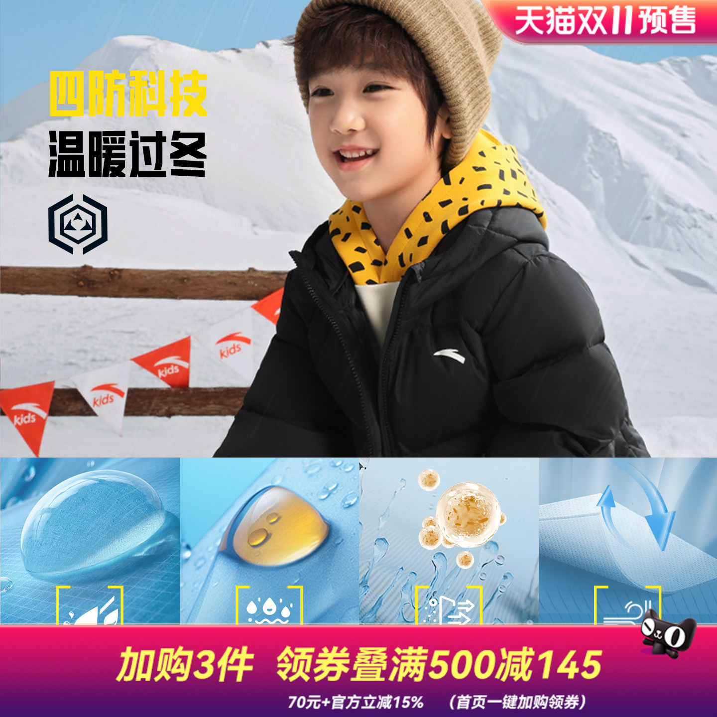 外层:采用安踏自主研发的「四防科技面料」,通过特殊涂层工艺实现防水、防油、防污、防风四重防护。雨水滴落如滑梯般迅速滚落,油污一擦即净,减少频繁清洗对衣物的损耗,尤其适合活泼好动、易弄脏衣物的儿童。