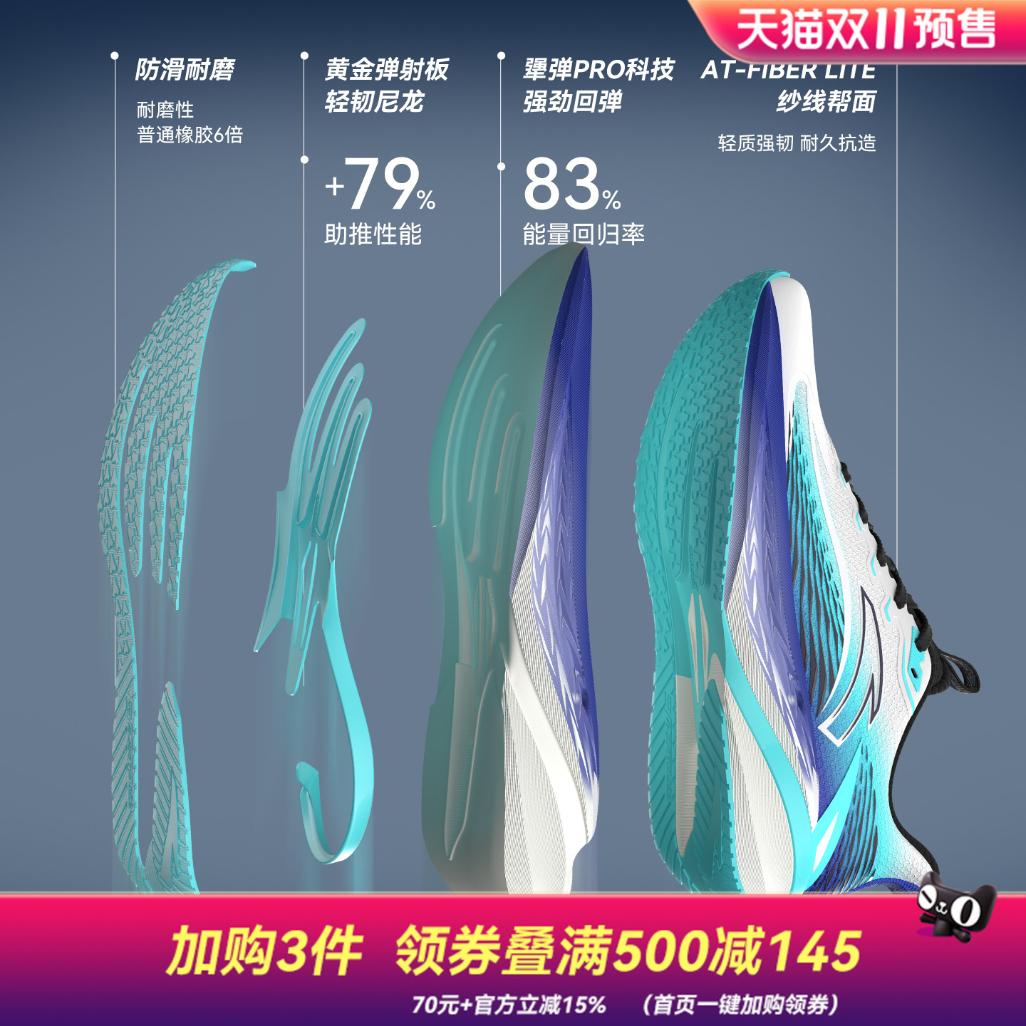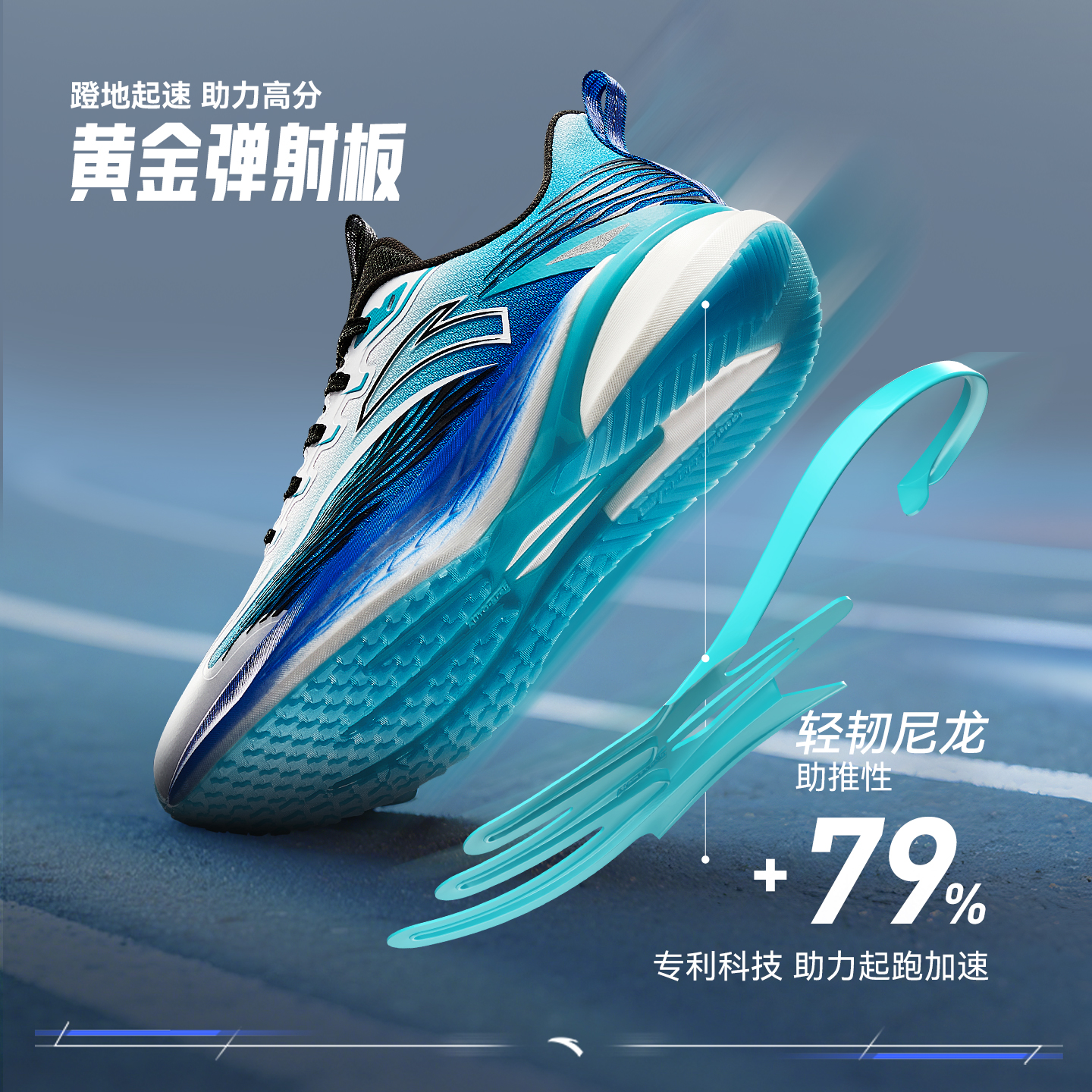 材质:鞋面采用透气网布+TPU支撑结构,轻盈透气不闷脚,鞋底搭载安踏独家“氮科技”中底,回弹率高达78%,每一步都像踩在弹簧上,减少运动损耗。
