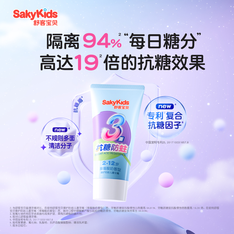 温和磨料:采用软性二氧化硅,清洁力强且不损伤牙釉质,适合儿童敏感口腔。