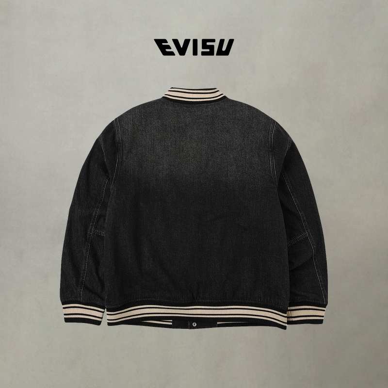 产品详情:EVISU福神2025秋季新品男士商标刺绣棒球服无领休闲通勤牛仔夹克