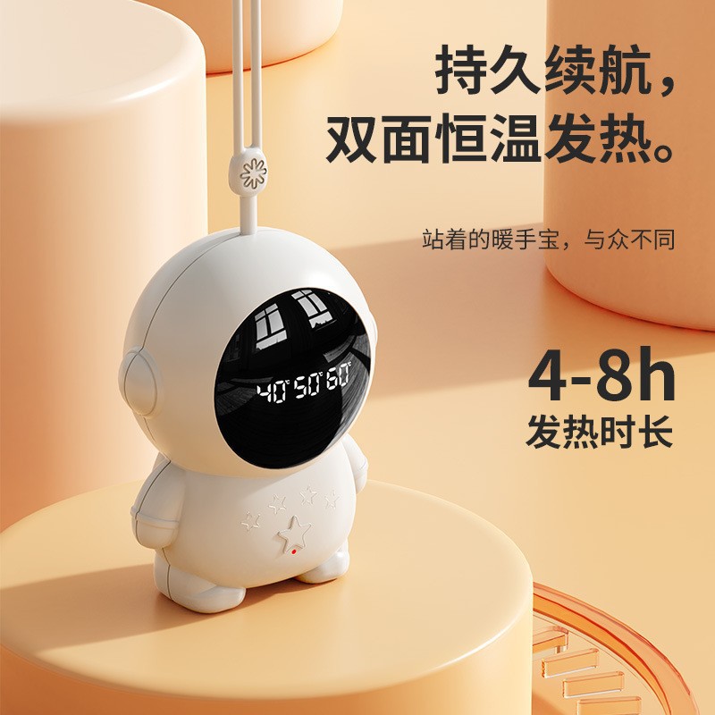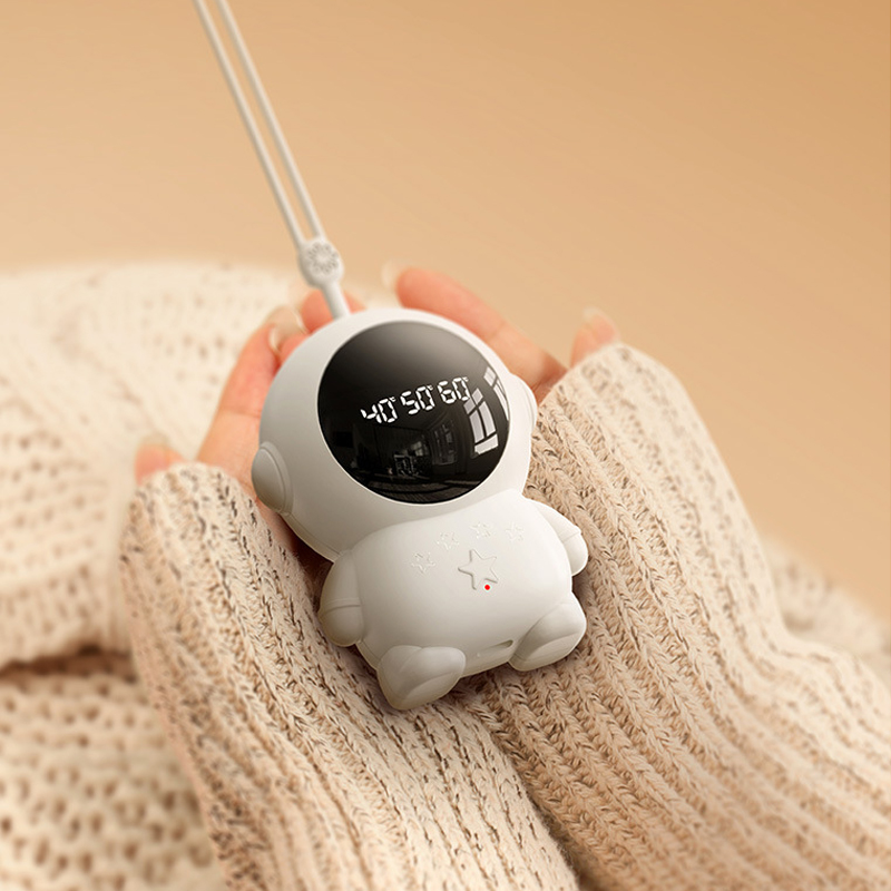 太空人暖手宝采用环保级ABS塑料外壳,表面经过磨砂处理,触感细腻防滑,同时具备良好的抗冲击性,确保日常使用中的安全与耐用。内部搭载高效能聚合物电池,结合智能温控芯片,实现快速加热与精准控温,为每一次使用提供稳定保障。
