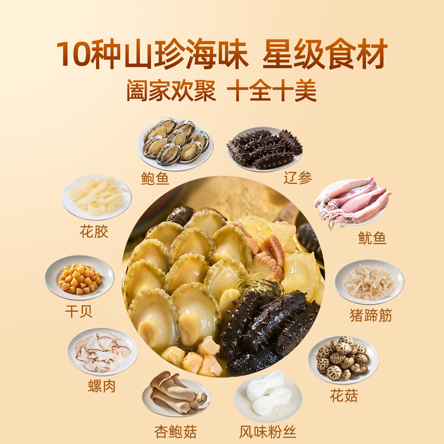 鲍鱼、辽参、花胶、干贝等10+种 |