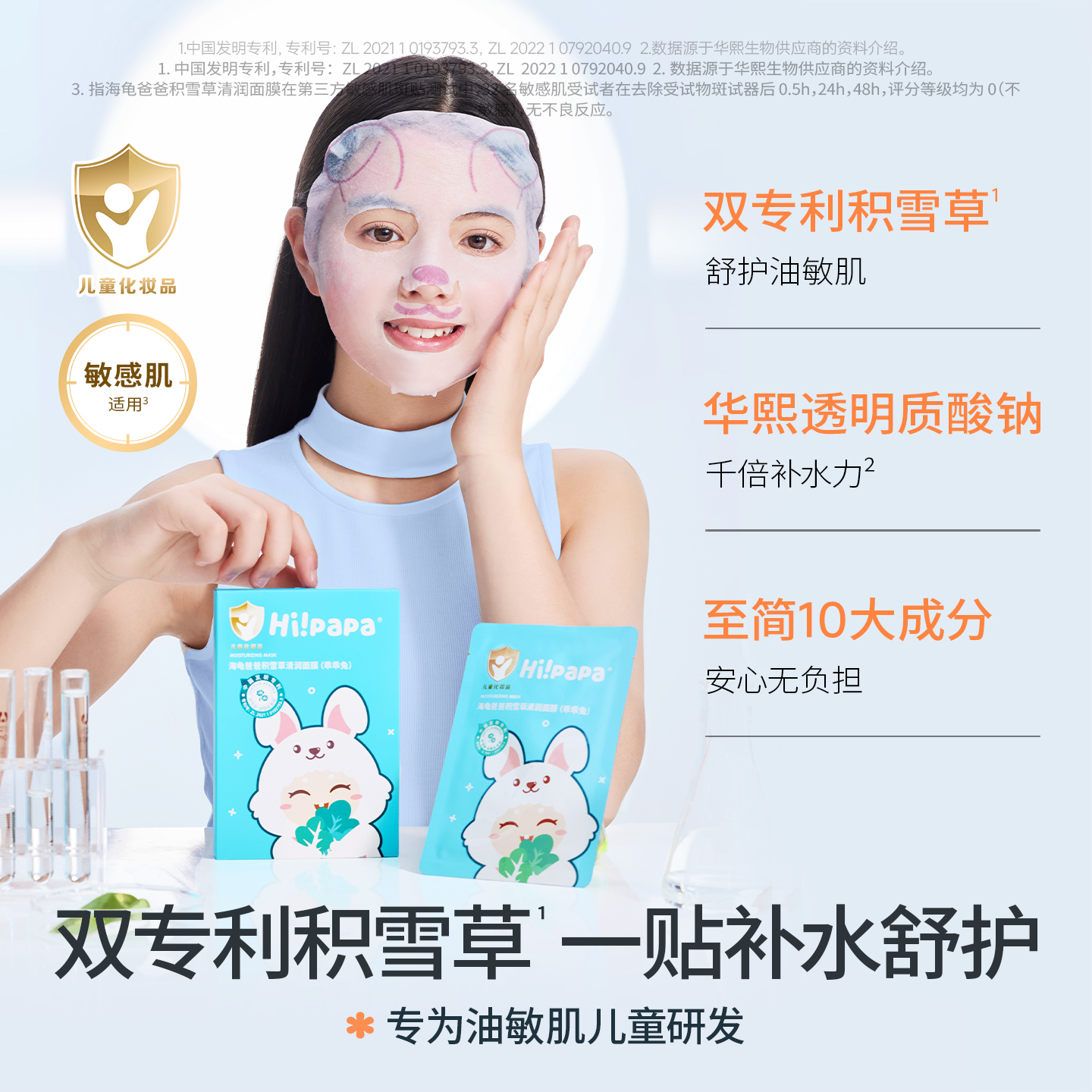 海龟爸爸小兔子儿童面膜,专为儿童娇嫩肌肤设计,采用专利植萃配方,核心成分包括华熙生物透明质酸钠与专利积雪草油律因子,双重保湿修护,温和不刺激。膜布选用100%婴儿级雪竹纤维,轻薄透气,贴合宝宝面部轮廓,柔软如云朵,避免摩擦敏感。全线成分通过儿童化妆品安全评估,无酒精、无香精、无荧光剂,10大至简配方,减少过敏风险,让家长更安心。