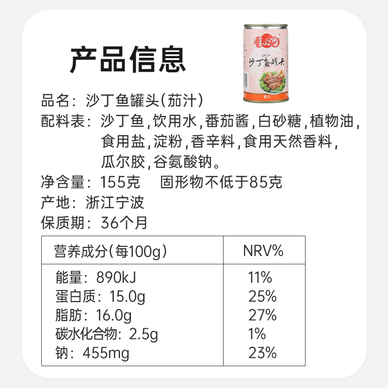 结语:无论是忙碌的上班族、注重营养的宝妈,还是追求便捷的健身人群,佳必可茄汁沙丁鱼罐头都能以“鲜美+健康+便捷”的三重优势,成为餐桌上的常备之选。12罐整箱装,囤一次吃一个月,从此告别“今天吃什么”的烦恼!