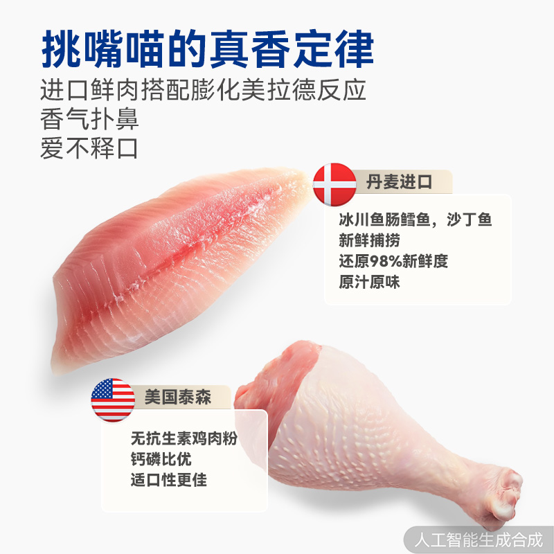 | 蛋白质来源 | 深海鳕鱼+泰森鸡肉粉 | 鸡肉粉/鱼粉(来源不明) | 三文鱼(单一蛋白) |