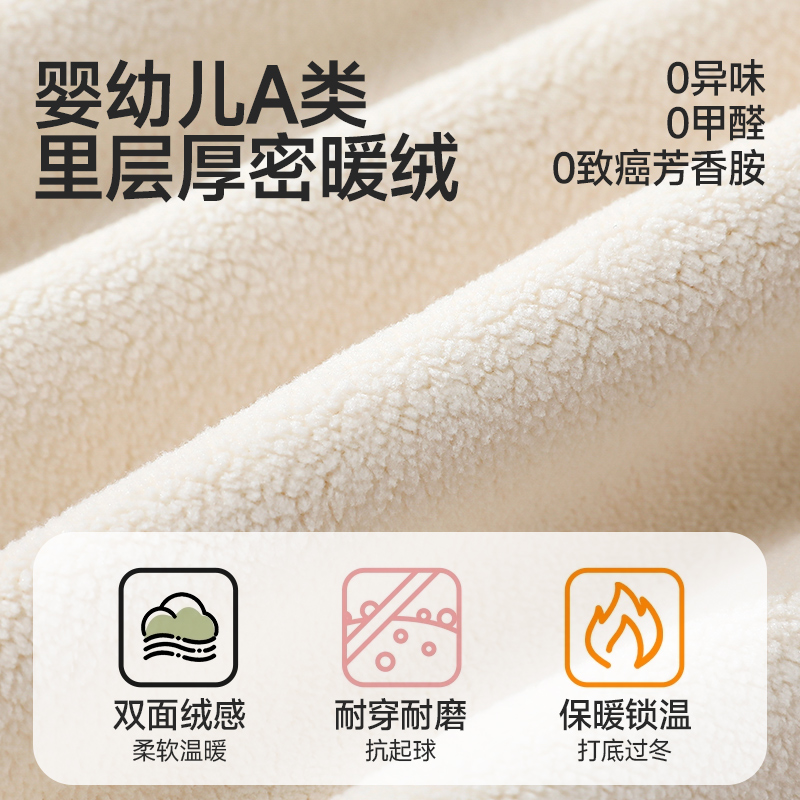 • A类婴儿绒无染色:采用符合国家A类婴幼儿标准的天然绒料,未添加任何化学染色剂,面料柔软亲肤,无刺激异味,适合敏感肌儿童。里层厚密暖绒,触感细腻如云朵,贴身穿着不扎肤。