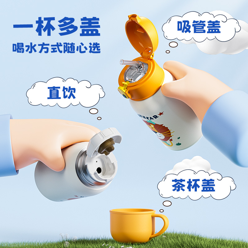 居家使用:一杯三盖设计(吸管盖/直饮盖/茶杯盖),满足不同年龄段需求,从学饮期到独立喝水期无缝切换。