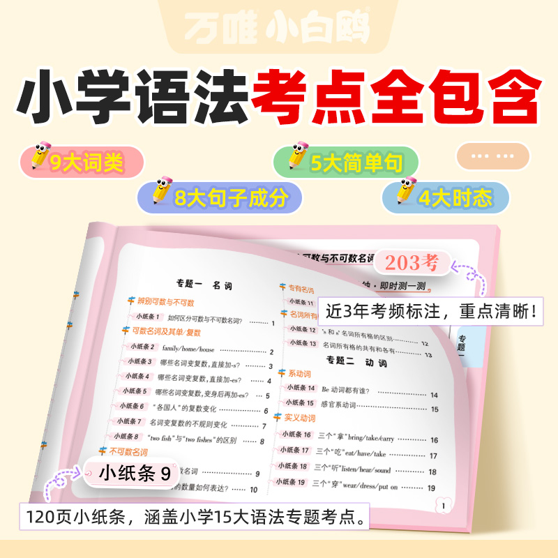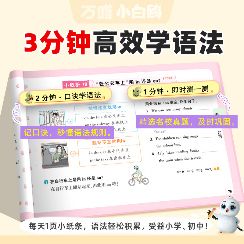 针对5-6年级学生英语语法薄弱痛点,2026版万唯小白鸥以「口诀+漫画+视频」三重记忆法,将抽象语法转化为趣味场景,每天3分钟掌握1个核心知识点,真正实现“学得快、记得牢、用得对”。