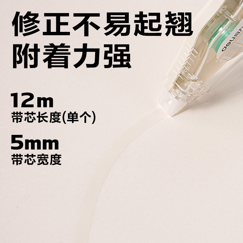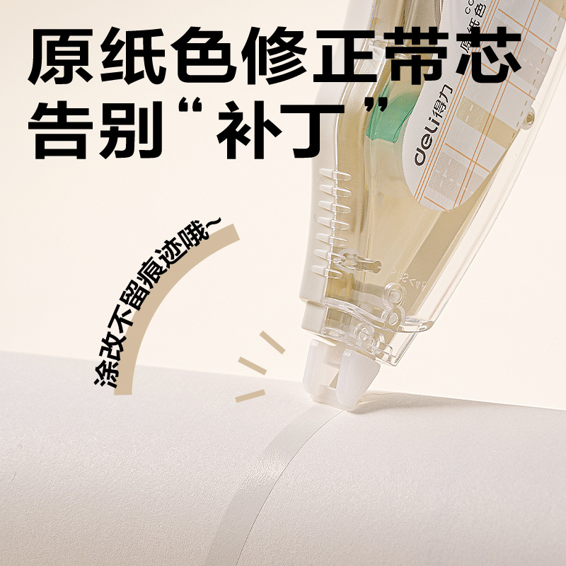 得力米黄色修正带采用高密度PET膜带,厚度达0.08mm,表面经过哑光磨砂处理,触感细腻不反光。修正带芯宽度升级至6mm,比普通款宽20%,覆盖错字更高效。内部齿轮结构采用双轴联动设计,出带均匀无卡顿,搭配可替换式拔帽外壳,有效防止胶带干裂和灰尘侵入,延长使用寿命。