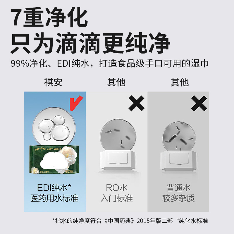 EDI纯化水+木糖醇:过滤7道工序,水质达饮用水标准,木糖醇成分温和抑菌,擦拭后不黏腻,宝宝舔舐无害。