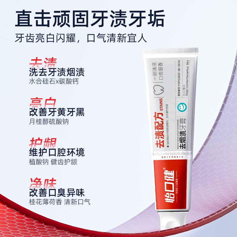 怡口健去烟渍美白牙膏采用天然植萃配方,核心成分包括: